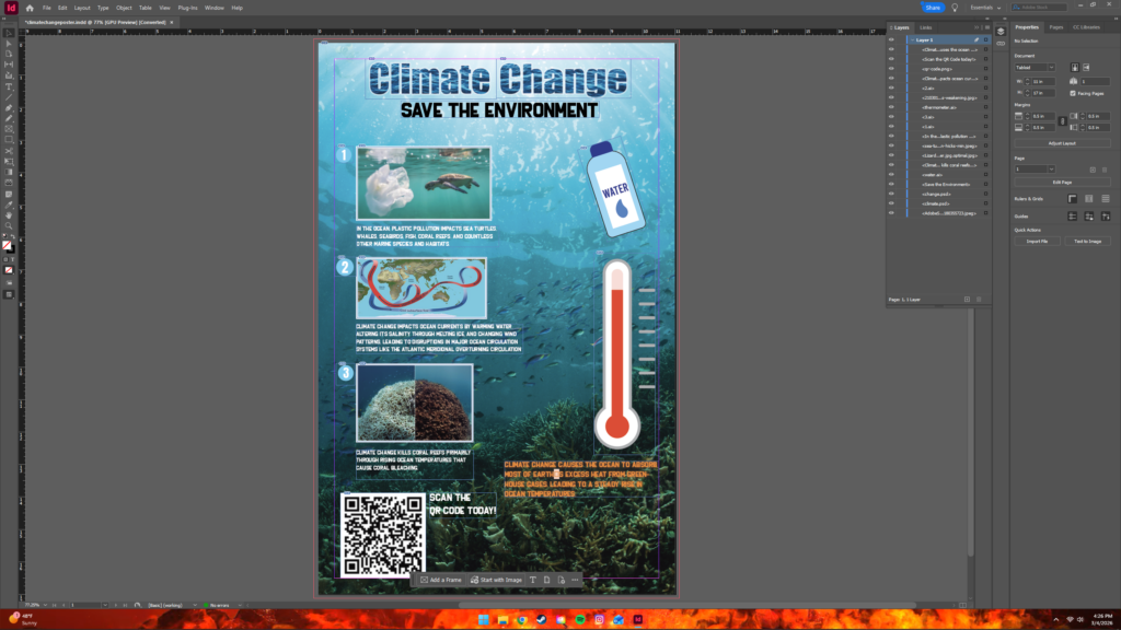 The climate change poster is a very fun poster to work on. Some challenges I’ve faced was figuring on what topic to I want to research on, as well as figuring out on where I was going to place my graphic elements from Adobe Stock. Overall, I’m happy with how I achieved the final result.