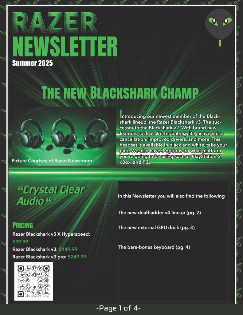 Some stuff I made in Digital Publishing Climate Change Poster Food menu redesign Typography Poster Trifold brochure (Herb assignment) Razer Newsletter